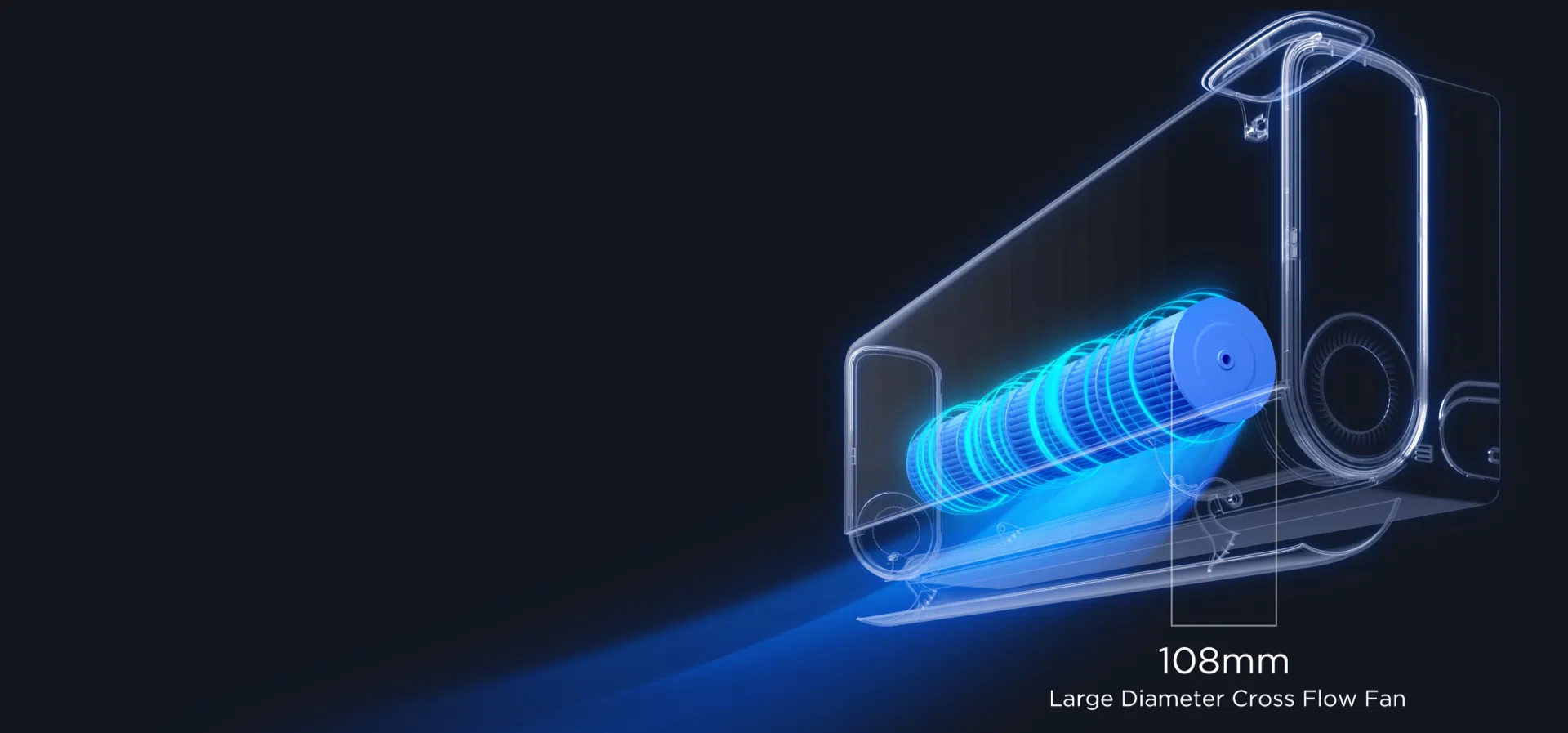 Zlepšuje cirkuláciu vzduchu pomocou krížového ventilátora s veľkým priemerom 108 mm, ktorý poskytuje stabilný prúd chladného vzduchu a energeticky efektívnejšiu prevádzku.