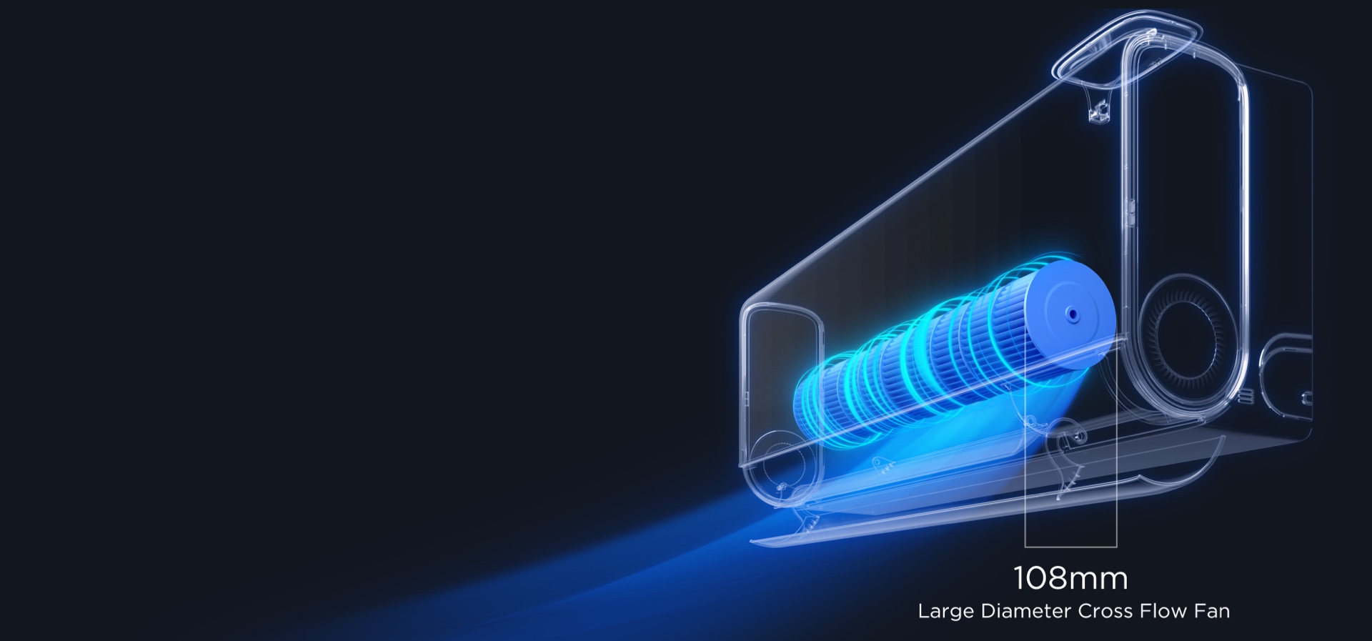 Zlepšuje cirkuláciu vzduchu pomocou krížového ventilátora s veľkým priemerom 108 mm, ktorý poskytuje stabilný prúd chladného vzduchu a energeticky efektívnejšiu prevádzku.