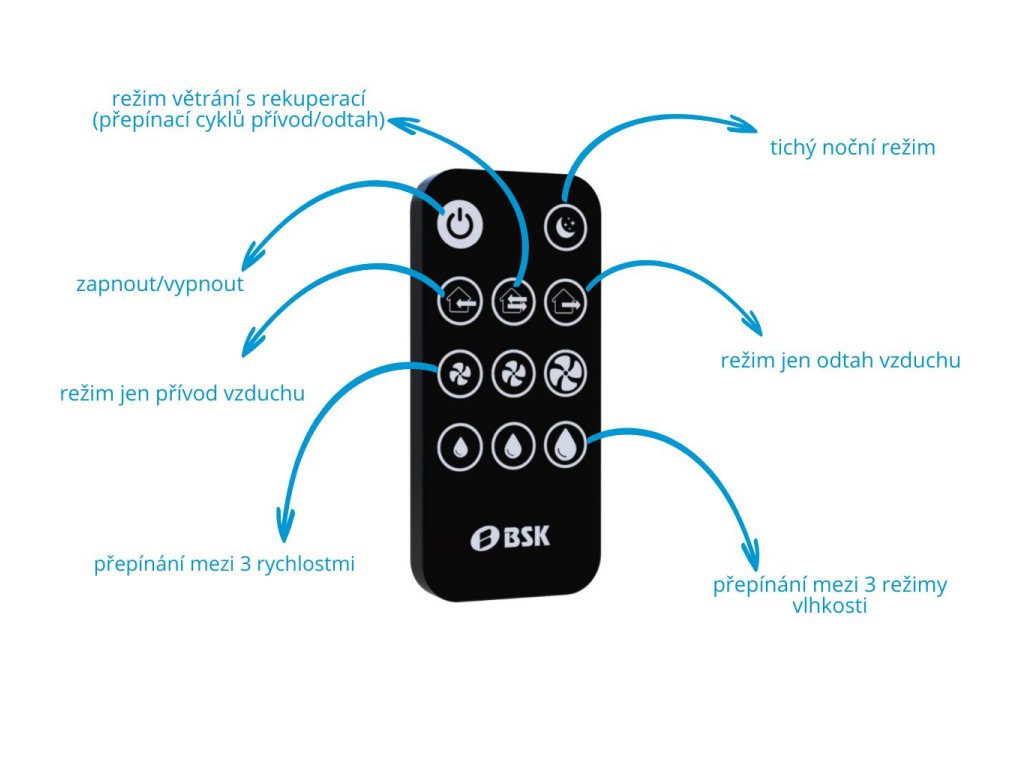 - Prevádzkové režimy: prívod, výfuk, rekuperacia, noc